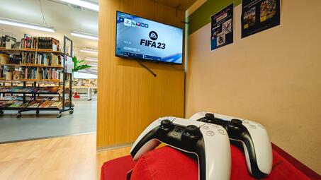 Gaming-Fans haben die Möglichkeit, in der „Begegnungsinsel“ an der Playstation 5 oder Nintendo Switch zu spielen. Es stehen verschiedene Games zur Auswahl, z. B. FIFA23, Minecraft oder Gran Turismo. Mit gültigem Bibliotheksausweis können die Controller für die vor-Ort-Nutzung ausgeliehen werden.