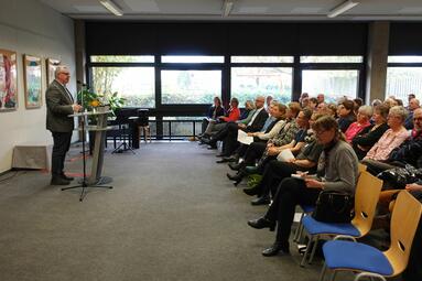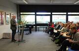 Vor Schüler*innen, Jury und Sponsoren präsentierte Preisträger Markus B. Altmeyer Auszüge aus seinem Romanmanuskript „Das magische Museum der Madame Michel“.