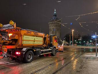 Immer Anfang November ist der Stadtraumservice Mannheim startklar für den Winterdienst. Bei sinkenden Temperaturen müssen vor allem die Brücken kontrolliert werden. Ca. 220 Mitarbeitende des Stadtraumservice und technische Mitarbeitende weiterer Dienststellen, die bei Schnee und Eis den Winterdienst unterstützen, sind in Bereitschaft. Bei einem Glätteeinbruch sind die städtischen Mitarbeitenden bereits in den frühen Morgenstunden zu Fuß und mit ihren Streufahrzeugen rund um die Uhr im Einsatz. Die Sicherheit der Verkehrsteilnehmenden insbesondere im fließenden Verkehr hat höchste Priorität: Bei starkem Schneefall werden zuerst wichtige Verkehhrswege, Brücken und Kreuzungsbereiche von Schnee und Eis befreit. Die wichtigsten Radwege werden im Einsatzfall, ebenfalls in der höchsten Prioritätsstufe, mit 10 Kleinstreuern geräumt und gestreut. Radwege der höchsten Prioritätsstufe, die sich auf Fahrbahnen befinden, werden von den Großstreuern mitbedient. Nach den verkehrswichtigen Straßen folgen weitere Straßen und Plätze, deren Reihenfolge anhand einer Prioritätenliste und akuter Meldungen abgearbeitet wird.