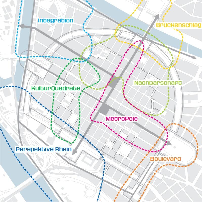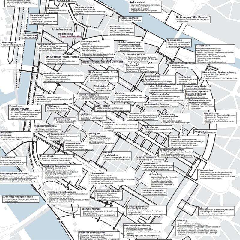Einer der Kernbestandteile des Konzeptes ist ein Pool mit über hundert unterschiedlichen Projektvorschlägen aus der Mannheimer Bevölkerung. Die Vielzahl an Projektvorschlägen wurden zudem räumlich-thematischen “Spannungsfeldern” zugeordnet, an denen sich die Innenstadtentwicklung der kommenden Jahre herauskristallisieren wird.