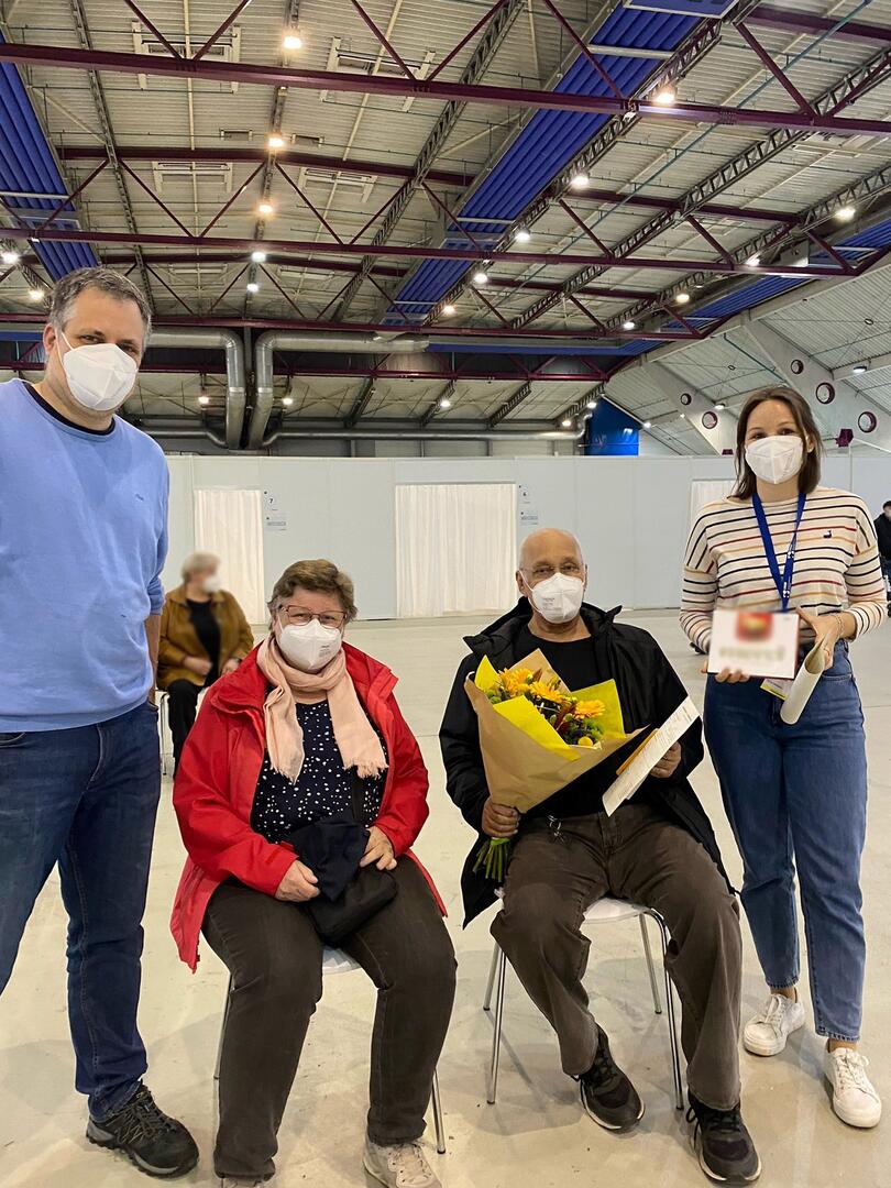 vlnr. Florian Schwöbel, stellv. medizinische Leitung Impfzentrum, Begleitperson von Herrn Karan, Yücel Karan, Nicole Tettweiler, Leitung Impfzentrum Mannheim