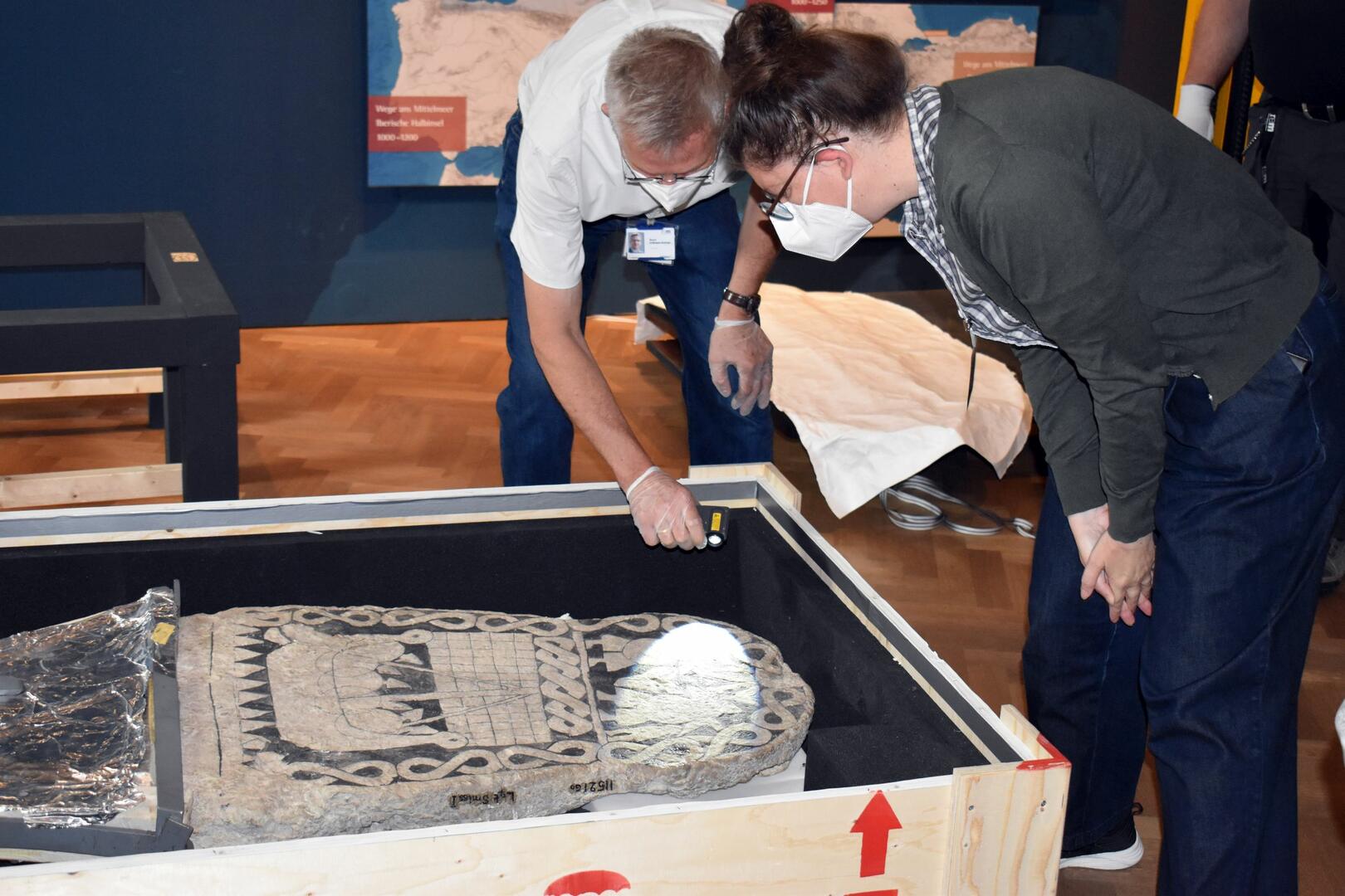 Spannender Moment: Die Transportkiste wird geöffnet. rem-Restaurator Bernd Hoffmann-Schimpf und Kurierin Amica Sundstrom kontrollieren, ob der Bildstein von Smiss den Transport gut überstanden hat.