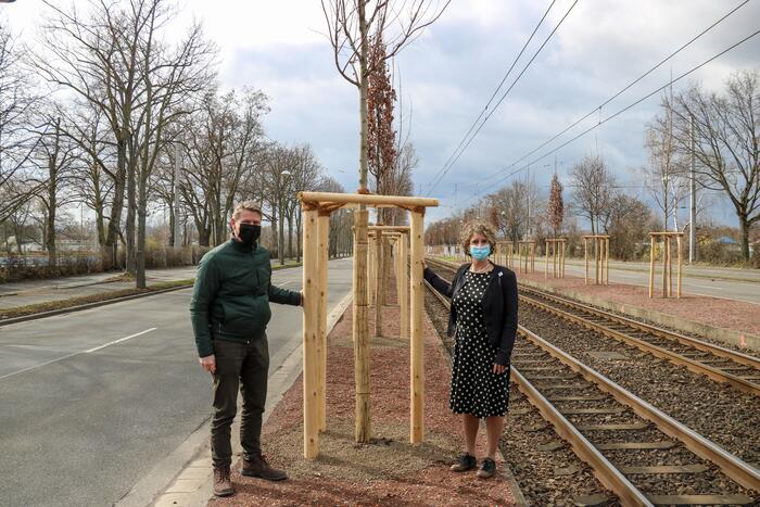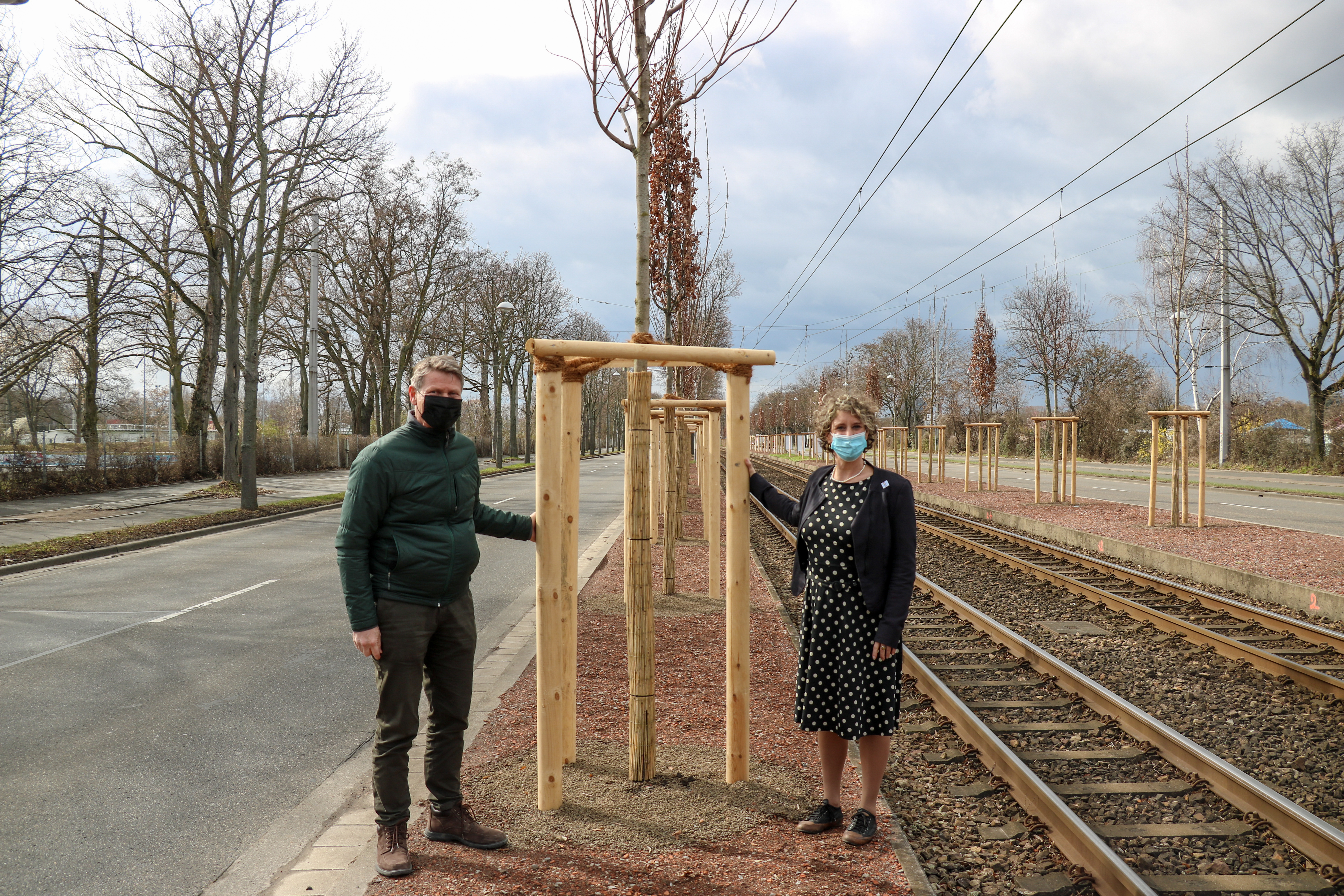 Frau Bürgermeisterin Prof. Dr. Pretzell und Herr Roeingh aus dem Leitungsteam des Eigenbetriebs Stadtraumservice schauen sich den Zwischenstand der Pflanzarbeiten in der Feudenheimer Straße an.