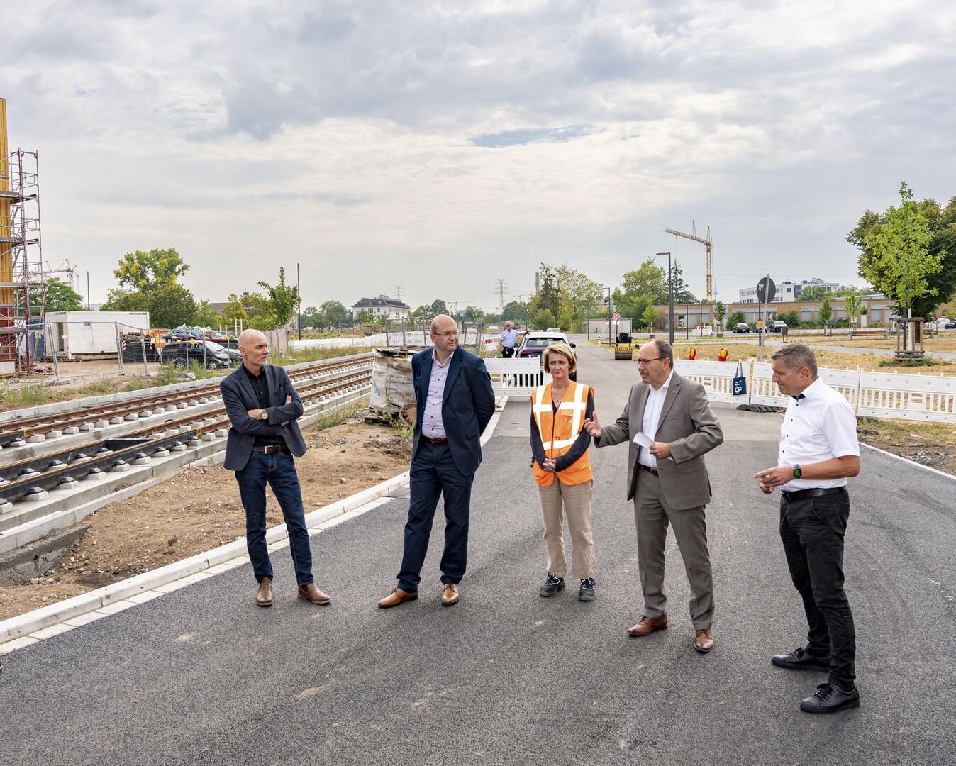 v.l.n.r.: Achim Judt, Geschäftsführer der MWS Projektentwicklungsgesellschaft mbH (MWSP), Marcus Geithe, Geschäftsführer der MV Mannheimer Verkehr GmbH, Andrea Böttger, Projektleiterin der rnv, Christian Specht, Erster Bürgermeister und ÖPNV-Dezernent der Stadt Mannheim, sowie Martin in der Beek, Technischer Geschäftsführer rnv, konnten sich bei einer Baustellenbegehung direkt vor Ort ein Bild vom aktuellen Stand der Arbeiten an der neuen Strecke sowie vom bisherigen Fortschritt der Baumaßnahme machen.