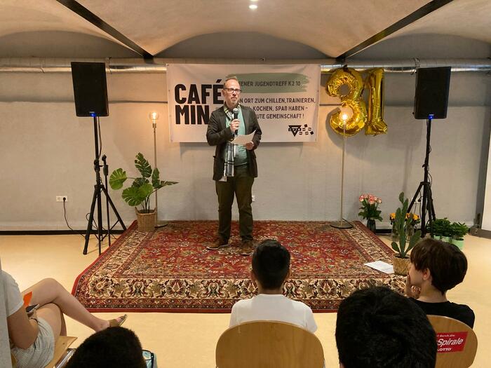 Bildungsbürgermeister Dirk Grunert überbrachte dem Café Mint zu seinem 31. Jubiläum die Grüße der Stadt.
