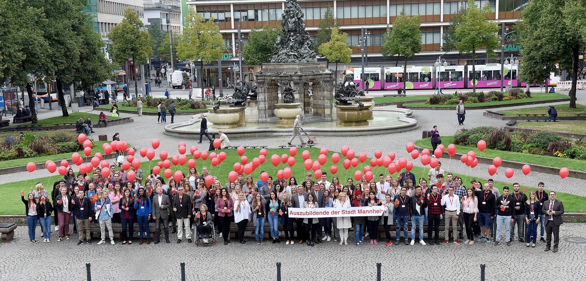 Unser Bild zeigt die neuen Auszubildenden, die ihre Wünsche an die Ausbildung bei der Stadt auf Kärtchen geschrieben haben, die sie - befestigt an roten Luftballons - in den Mannheimer Himmel steigen lassen.