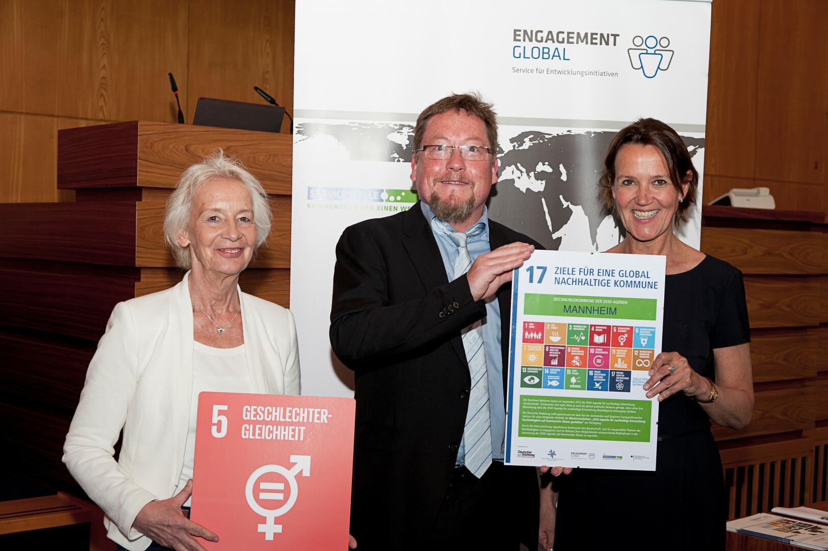 Unser Bild zeigt von links nach rechts: Annette Turmann von der Servicestelle Kommunen in der Einen Welt, Christian Hübel, Leiter der Strategischen Steuerung der Stadt Mannheim und Sabine Drees vom Deutschen Städtetag.
