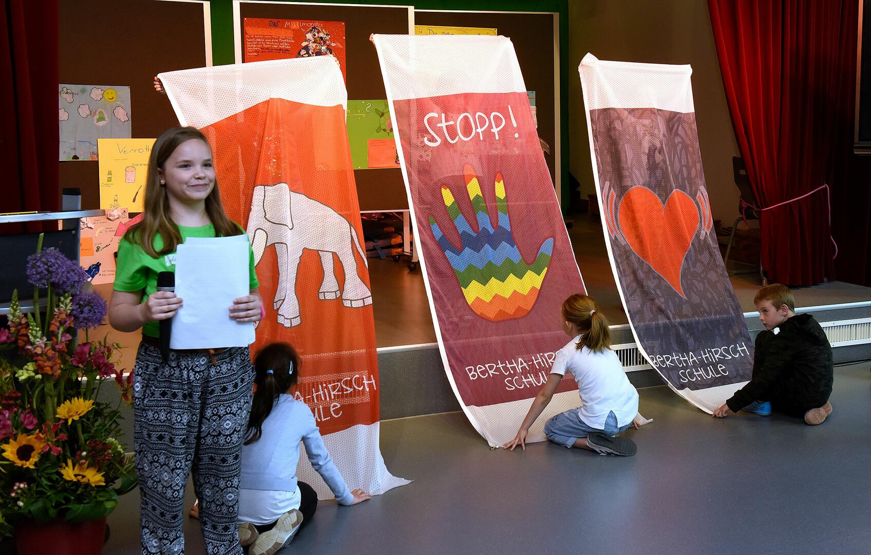 Die Flaggen der Schule (dickhäutiger Elefant, Stopp-Hand und Herz) als Ausdruck eines wertschätzenden Umgangs miteinander