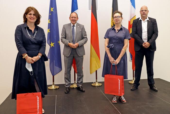 Generalkonsulin Dr. Ilde Valérie Gorguet, Erster Bürgermeister und Vorsitzender des Institut Français in Mannheim, Christian Specht, Generalkonsulin Catherine Eliane Veber und Honorarkonsul Folker R. Zöller in der Kunsthalle Mannheim (v.l.n.r.)