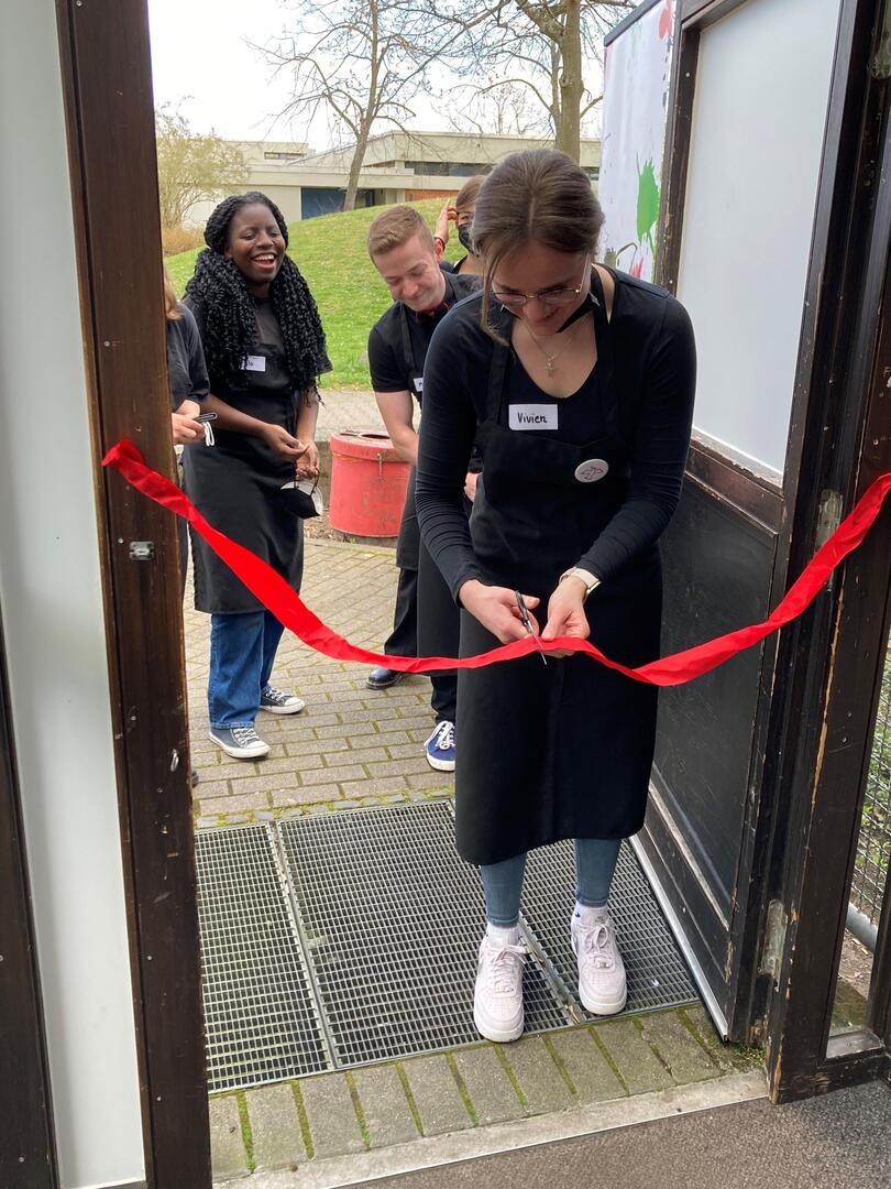 Vivien vom Organisationsteam zerschneidet das Band zur Eröffnung des neuen Café Klaus im Jugendhaus Vogelstang.