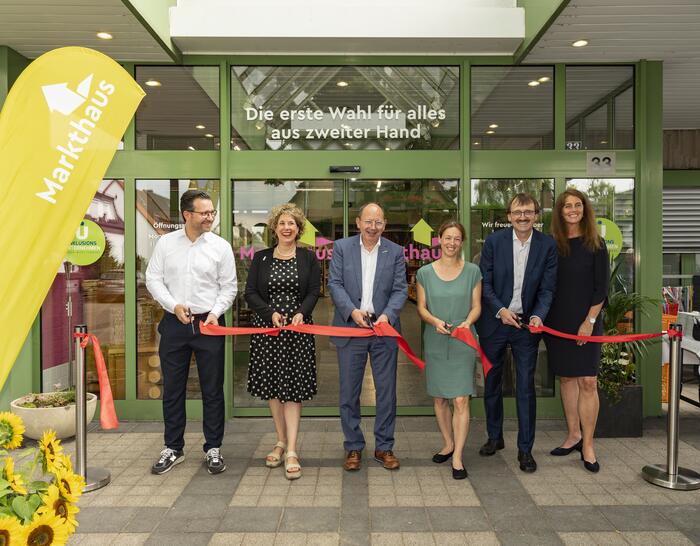 Oberbürgermeister Christian Specht (Mitte) freut sich mit Erster Bürgermeisterin Prof. Dr. Diana Pretzell (2. v. l.) und GBG-Geschäftsführer Karl-Heinz Frings (2. v. r.) über die Eröffnung des Markthauses im Morchhof