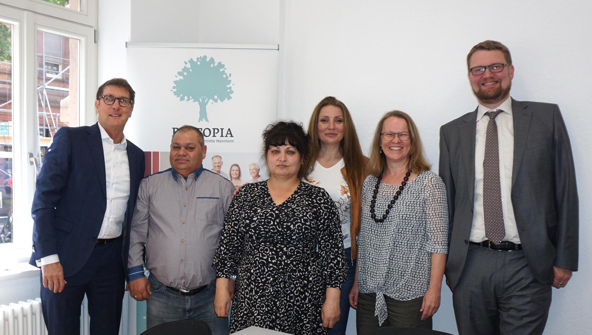 Auf dem Bild: Sozialbürgermeister Michael Grötsch, Evgeni Shishkov, Silvia Nicolova und Desislava Kostova-Georgieva (alle drei ZuwaMA-Teilnehmer), Sabine Neuber (Geschäftsführerin BIOTOPIA), Dr. Jens Hildebrandt (Geschäftsführer Jobcenter Mannheim)