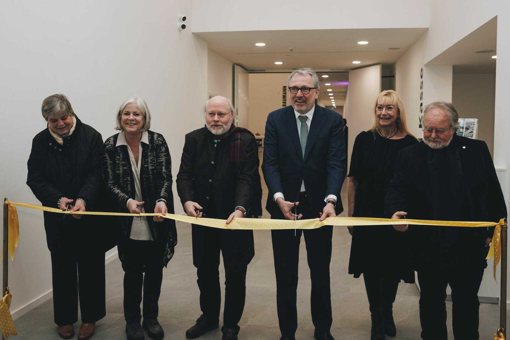 Freuen sich über die Eröffnung des neuen Museums Peter & Traudl Engelhornhaus: Die Töchter des Stifterpaares Angelika Milos-Engelhorn und Alissa Gerlich, rem-Generaldirektor Wilfried Rosendahl, Oberbürgermeister Peter Kurz, Susanne Hammer, Direktorin der Stiftungsmuseen, und Alfried Wieczorek, Vorstandsvorsitzender der Bassermann-Kulturstiftung, beim Durchschneiden des Bandes