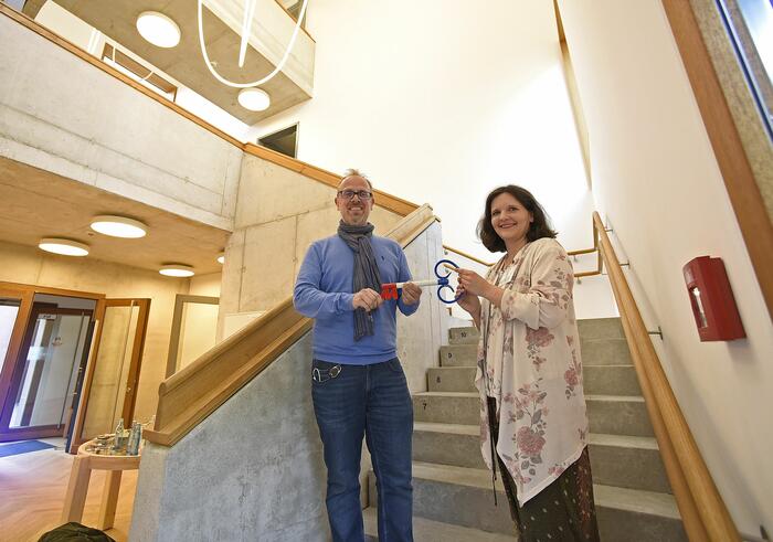 Neue Kita in moderner Architektur: Bildungsbürgermeister Dirk Grunert übergab zur Eröffnung symbolisch den Schlüssel für das neue städtische Kinderhaus Turley - die 55. städtische Kindertageseinrichtung in Mannheim - an Einrichtungsleiterin Julia Stock.