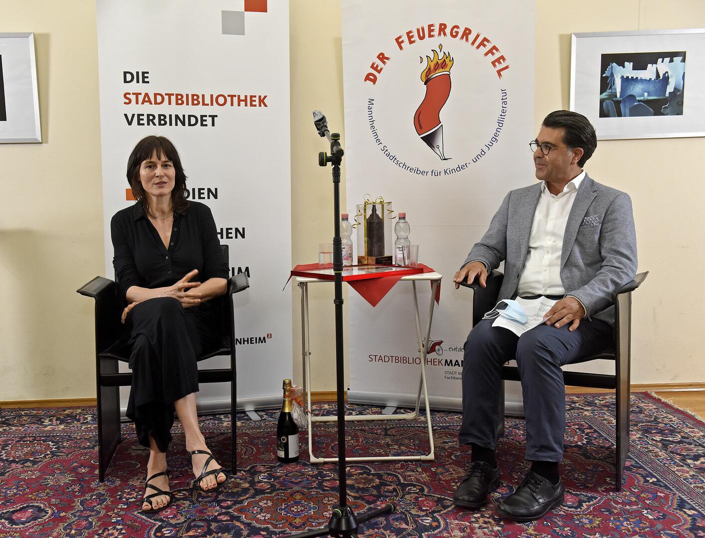 Der Leiter der Stadtbiblitothek, Yilmaz Holtz-Erşahin, im Interview mit der "Feuergriffel"-Stipendiatin 2021, Julia Willmann.