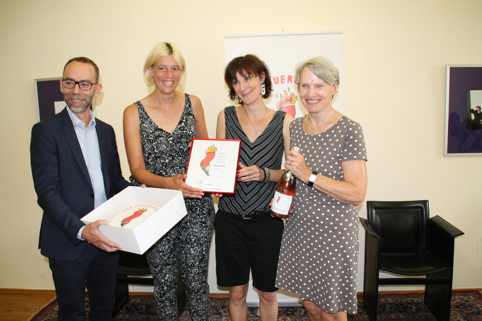 Bildungsbürgermeisterin Dr. Ulrike Freundlieb (rechts), sowie die Vertreter der beiden Sponsoren des „Feuergriffel“-Stipendiums, Antje Geiter von der Heinrich-Vetter-Stiftung und Heiko Brohm von der GBG (links) bei der Preisverleihung mit der Stadtschreiberin Tania Witte, dem Feuergriffel 2019 (2.v.r).