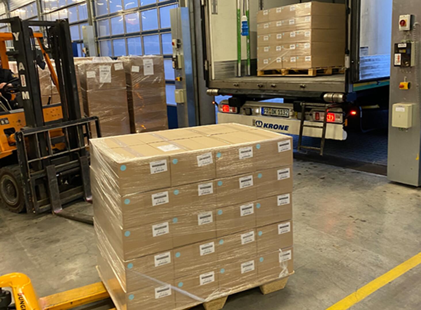 Die Berufsfeuerwehr hatte die Atemschutzmasken kommissioniert und vorbereitet, die Freiwillige Feuerwehr übernahm am Montagvormittag die Auslieferung.