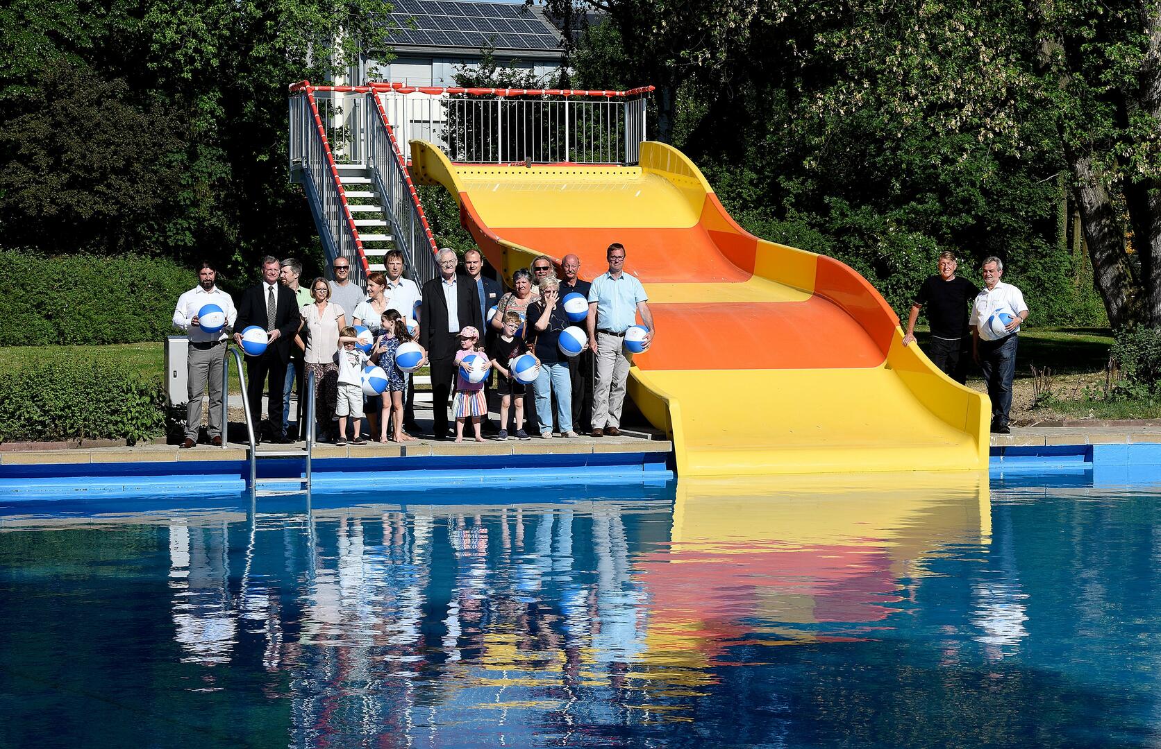 Vertreter des Stadtrats, Bezirksbeirats, Förderclub Freibad Sandhofen e.V. mit Unterstützern und des Fachbereichs Sport und Freizeit bei der Besichtigung der neuen Wasserrutsche im Freibad Sandhofen