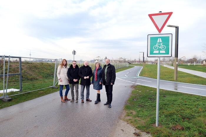 v.l. Eigenbetriebsleiterin Stadtraumservice Alexandra Kriegel, Bürgermeister Ralf Eisenhauer, Oberbürgermeister Christian Specht, Erste Bürgermeisterin Prof. Dr. Diana Pretzell, BUGA 23-Geschäftsführer Michael Schnellbach