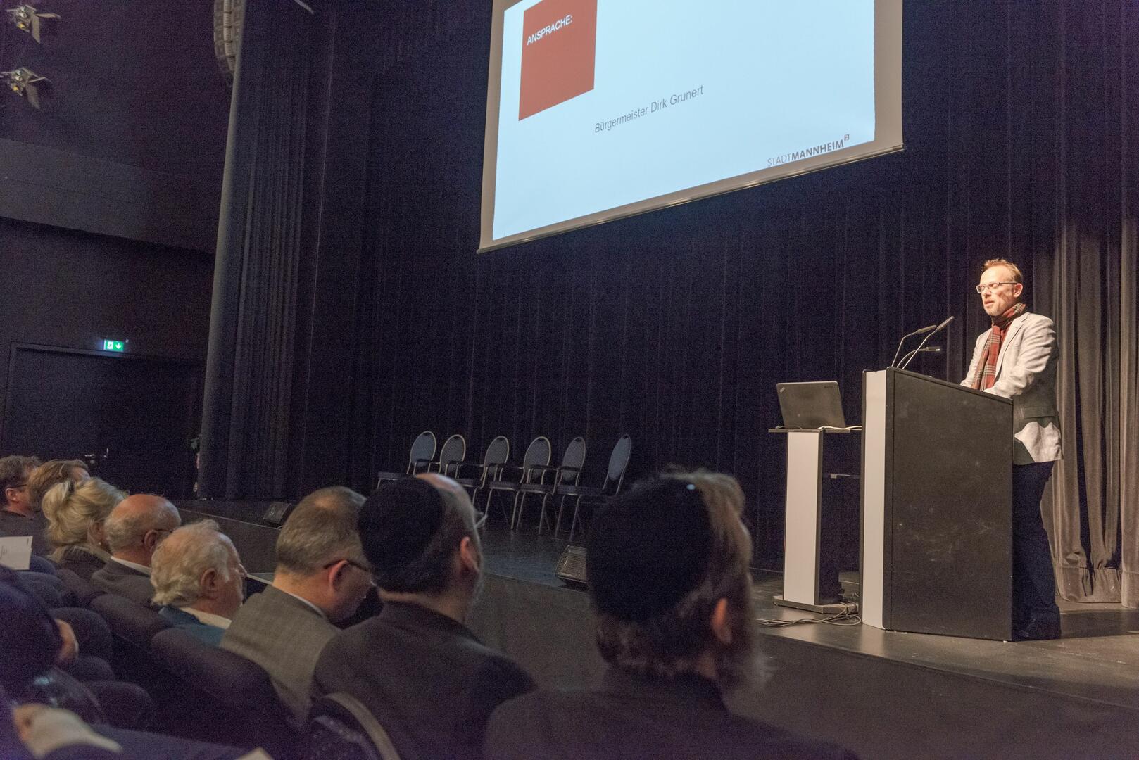Für die Stadt Mannheim begrüßte Bürgermeister Dirk Grunert die Besucher*innen der Gedenkveranstaltung zur Erinnerung an die Opfer des Nationalsozialismus.