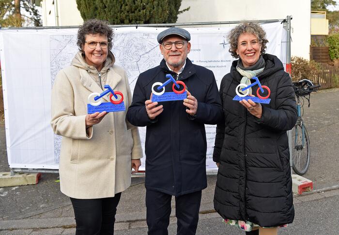 Erste Bürgermeisterin Prof. Dr. Diana Pretzell (rechts) übergab Regierungspräsidentin Sylvia M. Felder und Verkehrsminister Winfried Hermann ein sehr individuelles Präsent: Ein 3D-Druck eines Fahrrads in Mannheim-Farben.