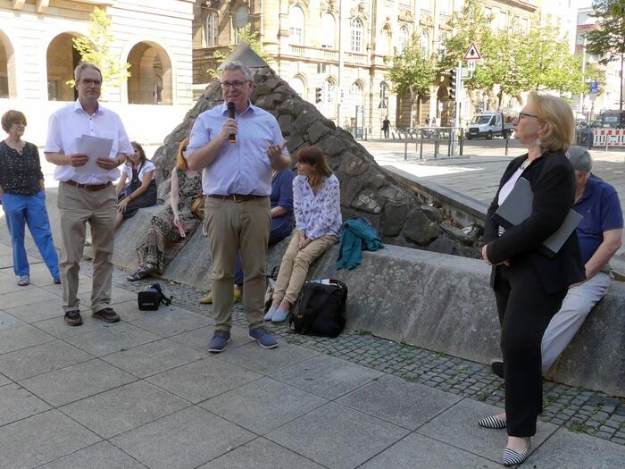 (v.l.) Dr. Jens Bortloff, Bürgermeister Thorsten Riehle und Helen Heberer vor dem Scherbenbrunnen, an dem eine Bronzetafel mit dem bekannten Mannheim-Zitat aus Goethes „Hermann und Dorothea“ an den Dichter und Denker erinnert