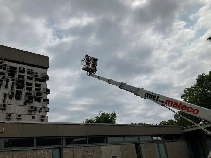 Für die Erste Bürgermeisterin Prof. Dr. Diana Pretzell gehts hoch hinaus, um sich ein Bild von der PV-Anlage auf der Trauerhalle zu machen