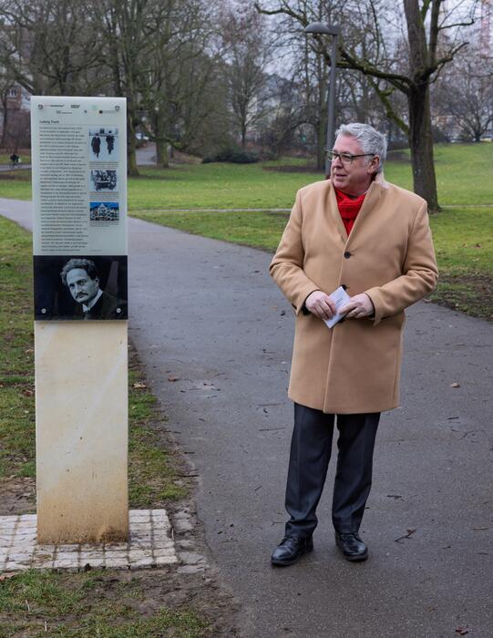 Kulturbürgermeister Thorsten Riehle an der Informationsstele am Ludwig-Frank-Denkmal