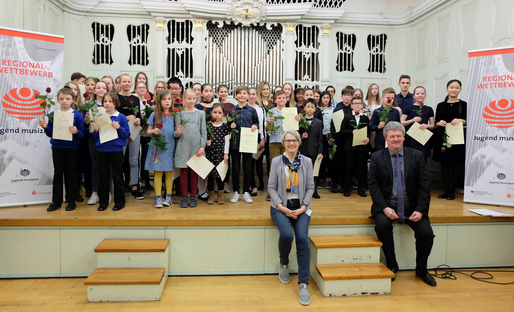 Gruppenfoto der Preisträger/-innen mit Bildungsbürgermeisterin Dr. Ulrike Freundlieb und Musikschulleiter Bjoern Strangmann