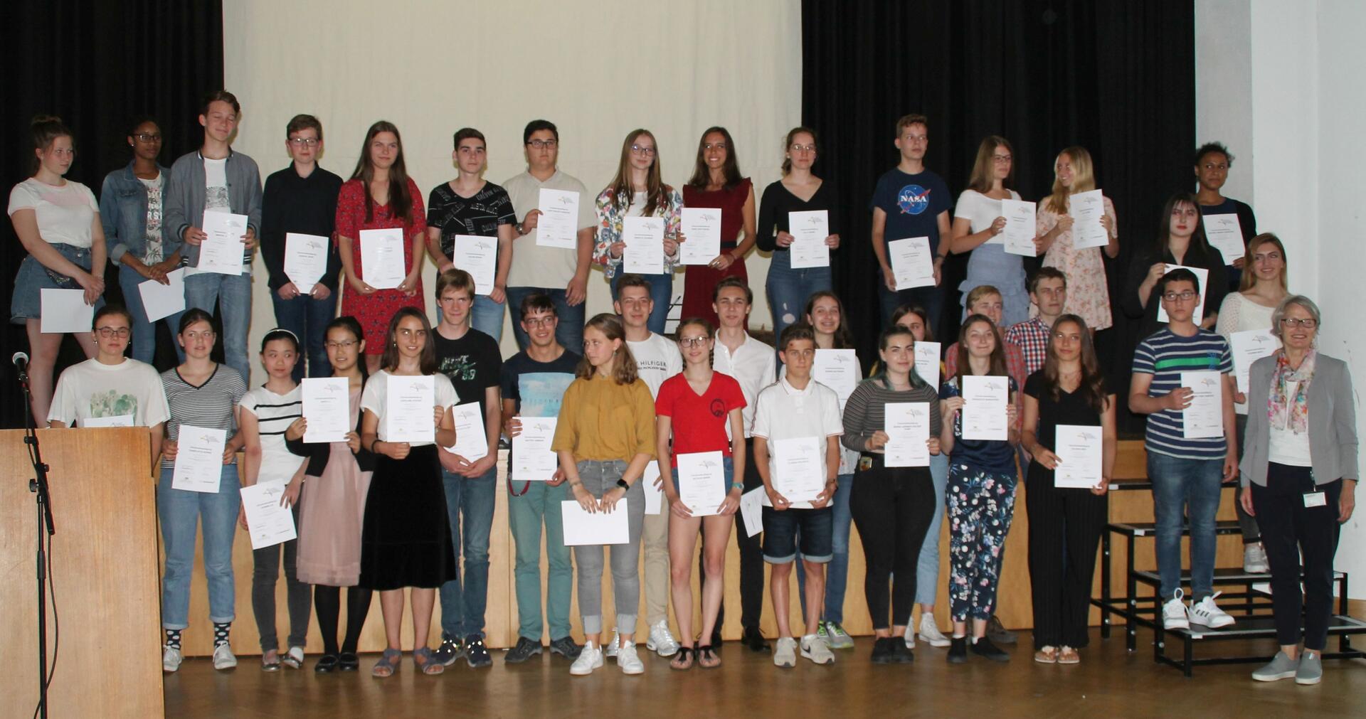 Bildungsbürgermeisterin Dr. Ulrike Freundlieb verleiht den Teilnehmer/-innen die Urkunden.