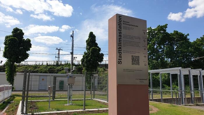 Die Klimastation in der Schlossgartenstraße misst im Zehn-Minuten-Takt Klimadaten in Mannheim. Eine Informationsstele, die mit einem QR-Code versehen ist, bietet nun die Möglichkeit diese Echtzeitdaten digital abzurufen.