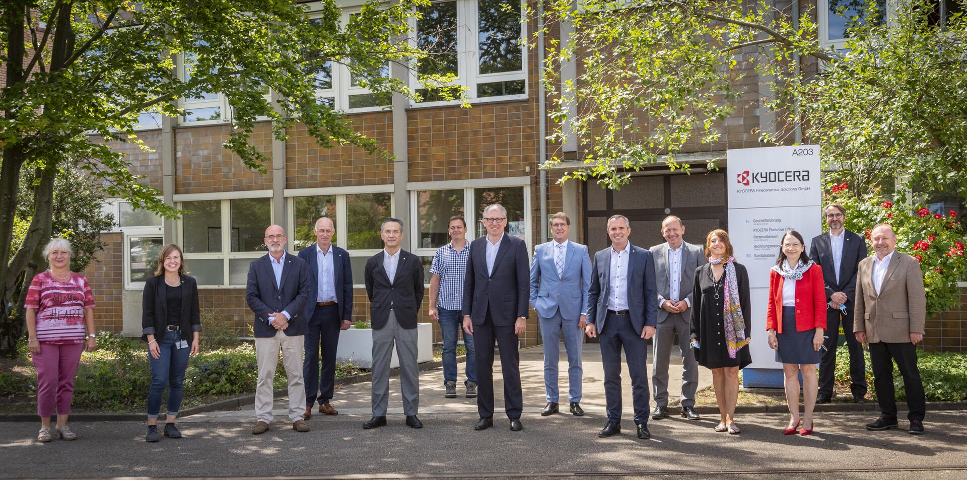 Auf dem Bild (u.a.) Mish Mishima, Vice President KYOCERA Corporation (5. v. l.), Oberbürgermeister Dr. Peter Kurz (7. v. l.), Wirtschaftsbürgermeister Michael Grötsch (8. v. l.), Armin Kayser, Geschäftsführer KYOCERA Fineceramics Solutions GmbH (9. v. l.), Erster Bürgermeister Christian Specht (10. v. l.), Christiane Ram, Leiterin der Wirtschaftsförderung (12. v. l.), Dr. Wolfgang Miodek, stellv. Leiter der Wirtschaftsförderung (14. v. l.)