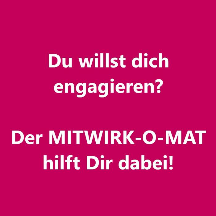 Zurück zur Übersicht Bild | 3. Januar 2024 - 14:00 MITWIRK-O-MAT - Du willst Dich engagieren? Mehr lesen