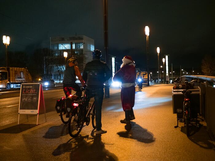 Der Verkehrs-Nikolaus verteilte an Radfahrende mit Licht Schokoherzen.