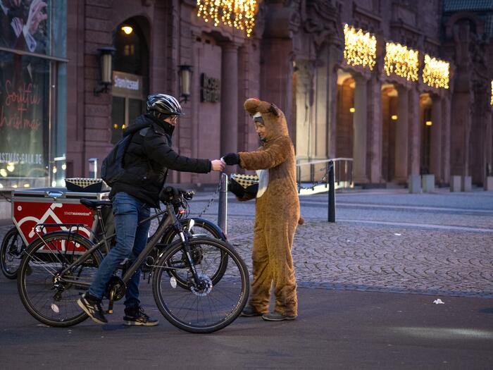 Rentier beschenkt Radfahrer, der mit Licht in der dunklen Jahreszeit unterwegs war