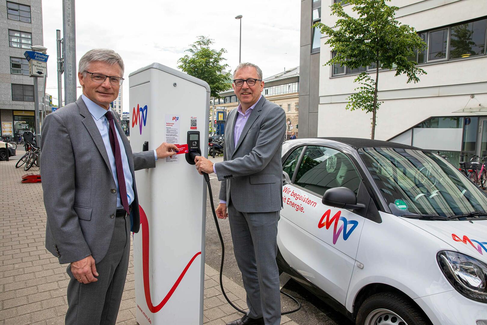 Oberbürgermeister Dr. Peter Kurz und MVV-Vorsitzender Dr. Georg Müller am neuen Ladepunkt in L 13