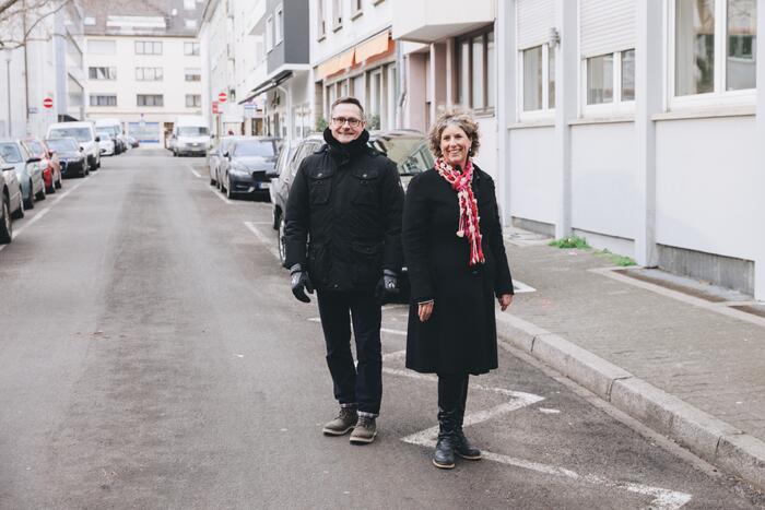 Legalisierung des Gehwegparkens im Straßenabschnitt am Parkplatz M4a mittels Markierung und Beschilderung. Auf dem Bild Bürgermeister Ralf Eisenhauer und Bürgermeisterin Prof. Dr. Diana Pretzell.