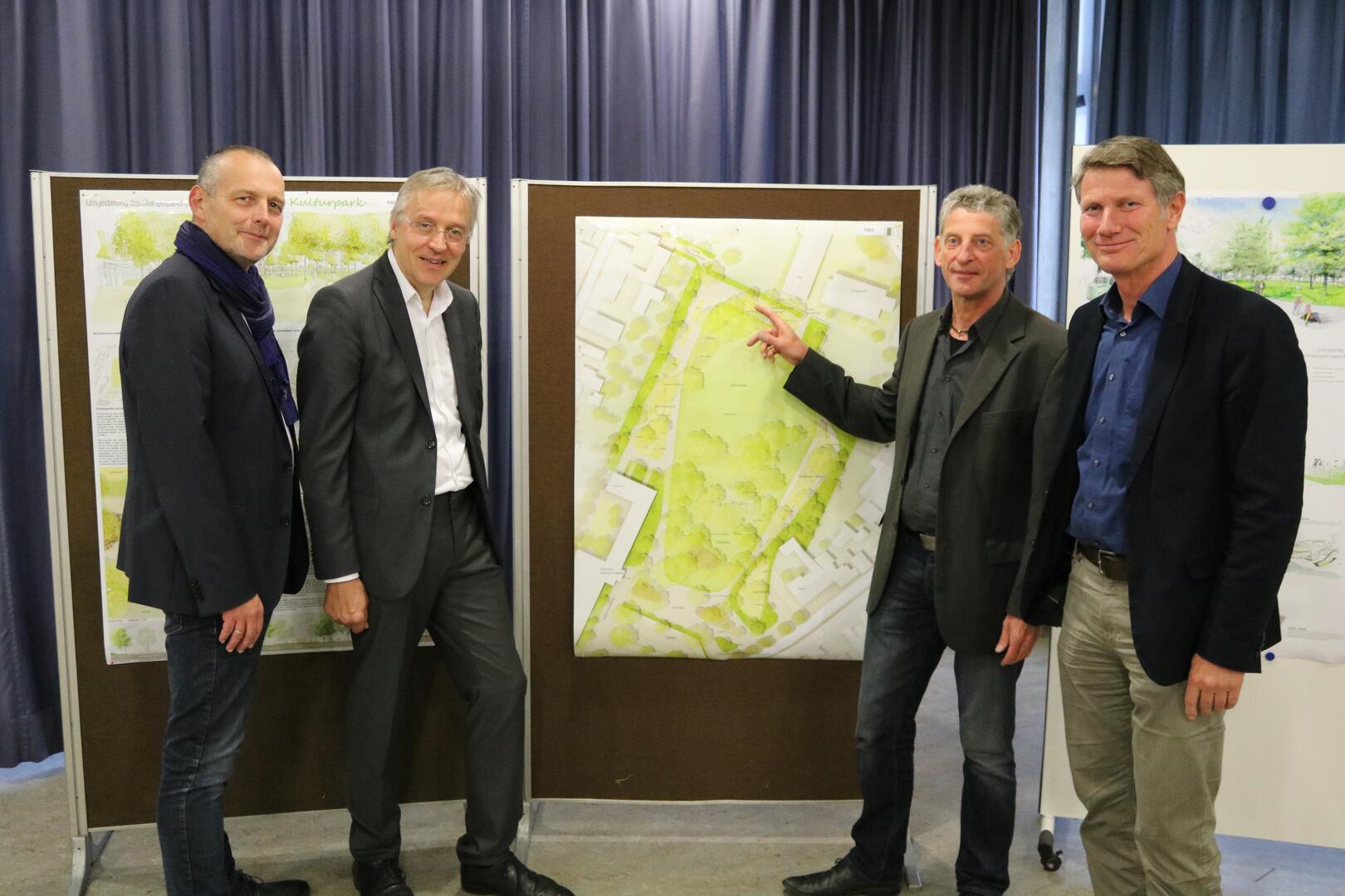 v.l.: Dr. Alexander Kuhn, MVV Regioplan, Klaus Elliger, Fachbereichsleiter Stadtplanung, Martin Schedlbauer, Faktorgrün, Markus Roeingh, Fachbereichsleiter Grünflächen und Umwelt