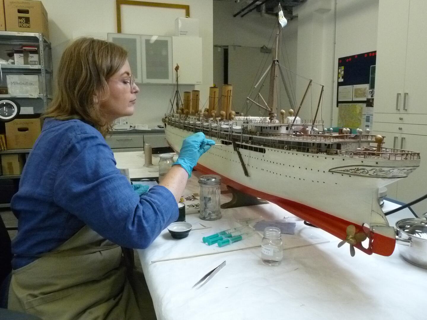 Blick ins Atelier: Restauratorin Gisela Gulbins bei der Arbeit am Modellschiff "Deutschland". Frisch restauriert ist es jetzt in der Ausstellung "Belle Époque" der Reiss-Engelhorn-Museen zu sehen.