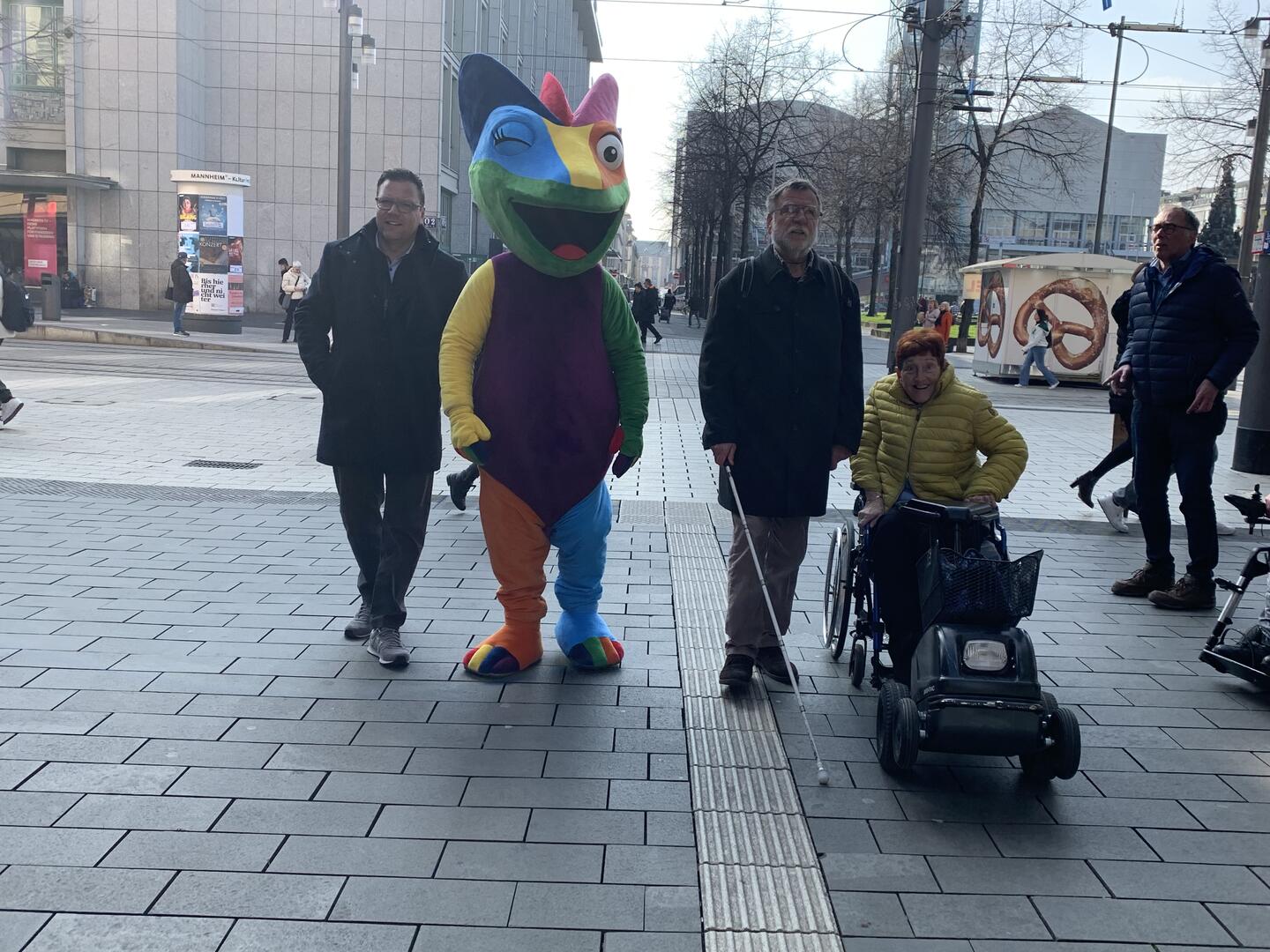 Bürgermeister und Sicherheitsdezernent Dr. Volker Proffen, Maskottchen Chämy, Karlheinz Schneider vom BBSV, Elke Campioni von der AG Barrierefreiheit Rhein-Neckar e. V. beim Rundgang