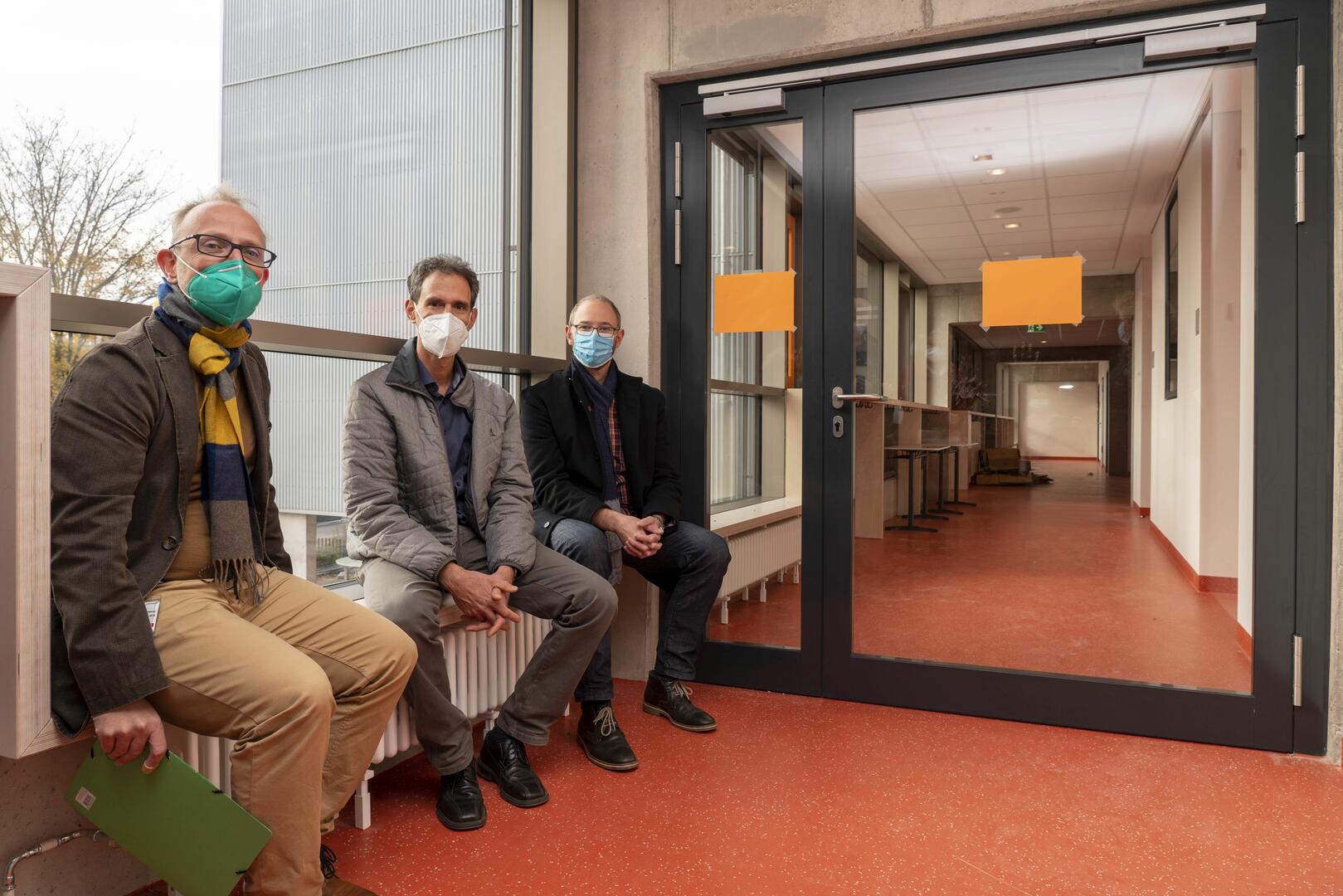 Bildungsbürgermeister Dirk Grunert, Schulleiter Stefan Bolay und BBS-Geschäftsführer Peter Doberass (v.l.) besichtigten anlässlich der offiziellen Übergabe des ersten Bauabschnitts der generalsanierten Schillerschule die neuen Räume.