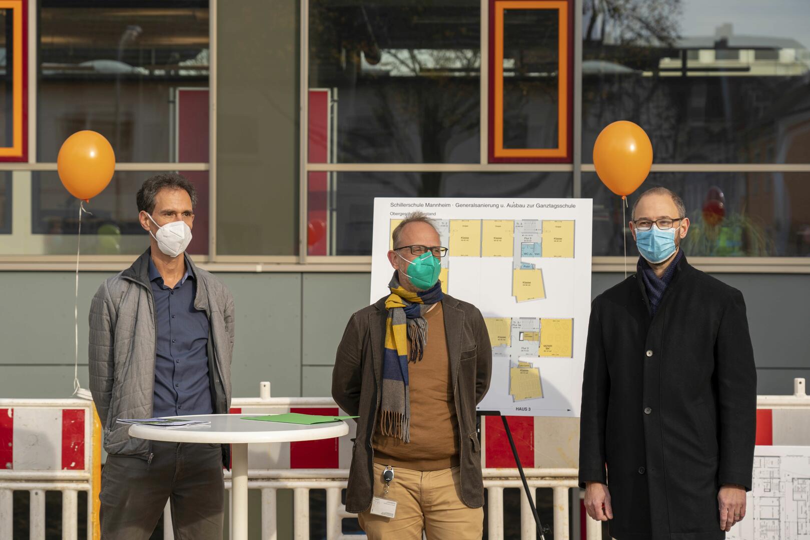 Schulleiter Stefan Bolay, Bildungsbürgermeister Dirk Gurnert und BBS-Geschäftsführer Peter Doberass erläuterten die Baumaßnahmen an der Schillerschule. Der erste Bauabschnitt im Rahmen der Generalsanierung und dem Ausbau zur Ganztagsschule ist abgeschlossen.