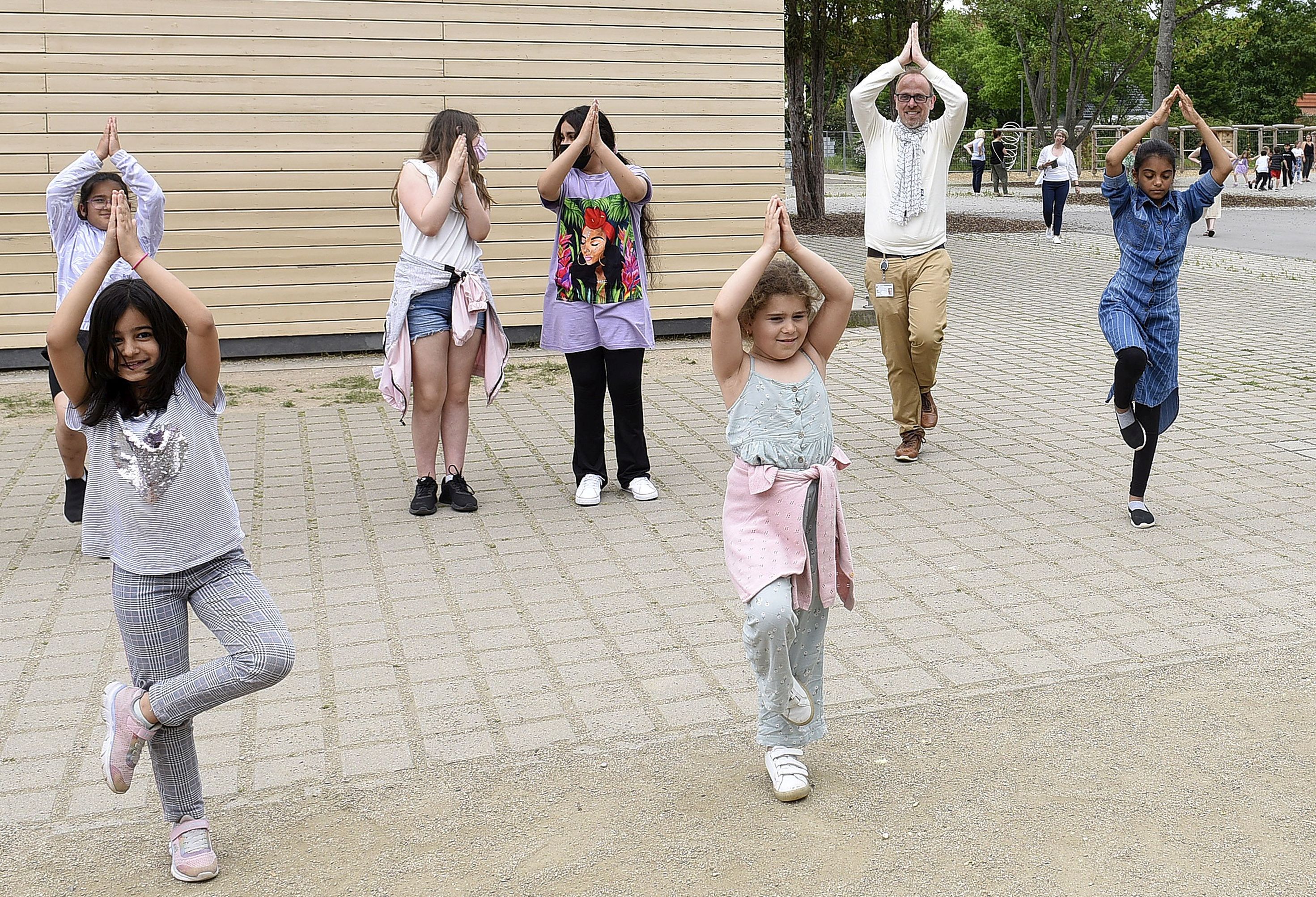 Gesundheitsbürgermeister Dirk Grunert eröffnete nach einer "bewegten Hofpause" an der Hans-Christian-Andersen-Schule, bei der die Schüler*innen an unterschiedlichen Bewegungsaktionen wie hier Yoga teilnehmen konnten, offiziell die Schönauer Gesundheitswoche, die unter dem Motto "Gemeinsam.Gerne.Gesund" steht.