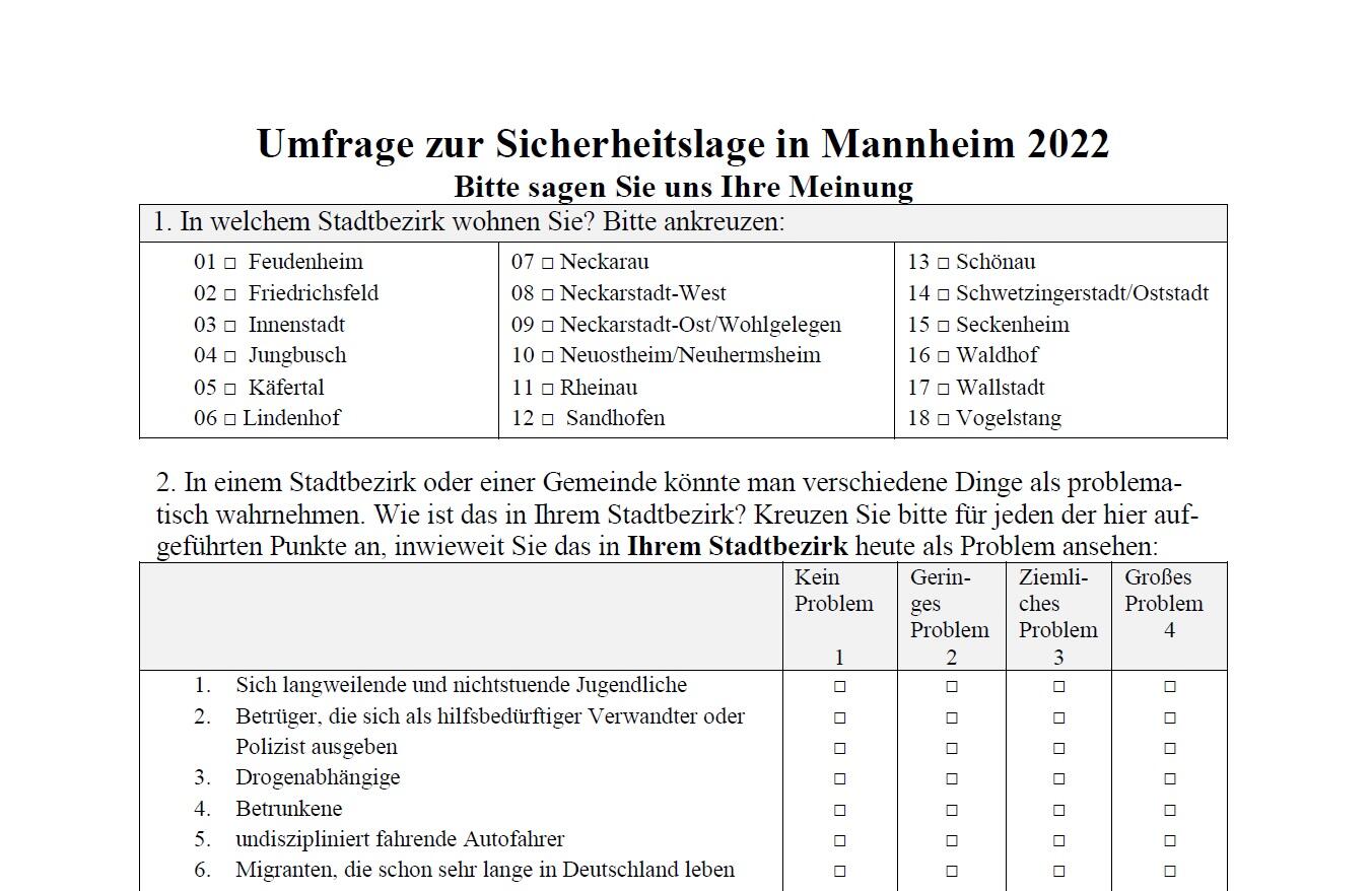Zurück zur Übersicht Bild | 29. November 2022 - 15:00 Sicherheitsbefragung 2022 Mehr lesen Beschreibung Sicherheitsbefragung 2022 Rechte Stadt Mannheim Download Sicherheitsbefragung 2022_0.jpg (285.44 KB)