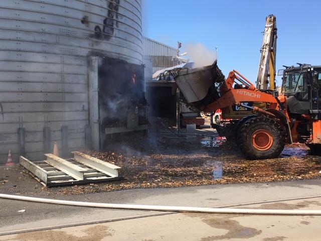 Mit einem Radlader werden die Holzschnitzel ins Freie gezogen und dort gelöscht.