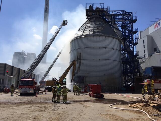In dem Silo des Biomassekraftwerks lagern Holzschnitzel. Diese sind in Brand geraten.