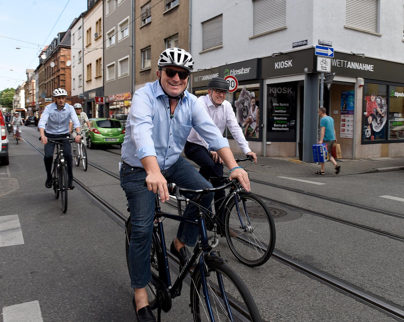 Sozialminister Manne Lucha bei seiner Fahrradtour durch die Neckarstadt-West