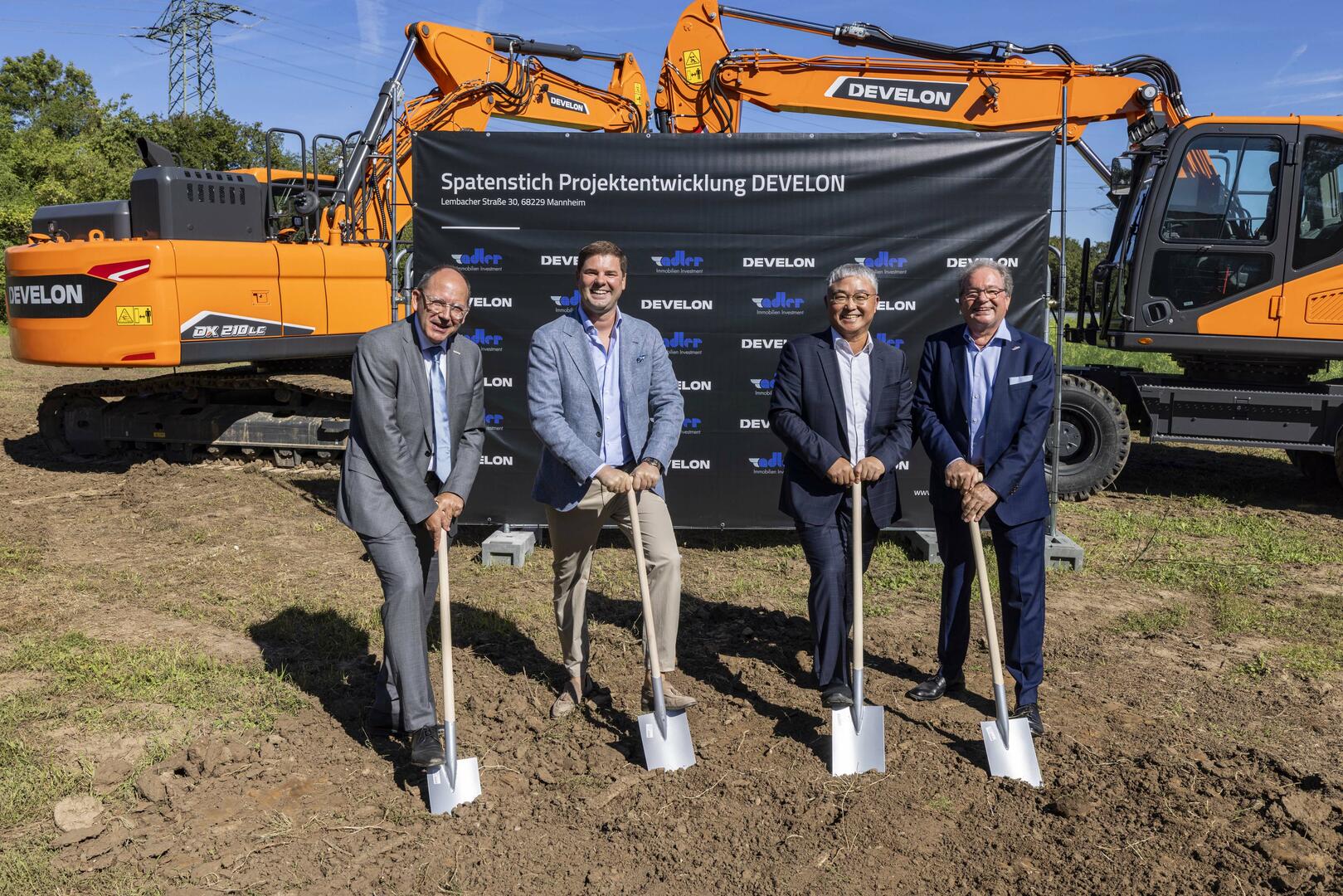 Unser Bild zeigt von links nach rechts Oberbürgermeister Christian Specht, Alexander Adler (CEO ADLER Investment), Seunghyun Oh(CEO HD Hyundai Infracore), Johann Georg Adler III (Gesellschafter, Vorsitzender des Beirats ADLER Investment)