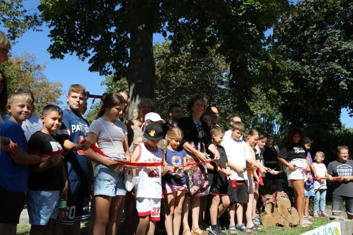 Kinder und Jugendliche zerschneiden gemeinsam mit der Ersten Bürgermeisterin Prof. Dr. Pretzell das Band.