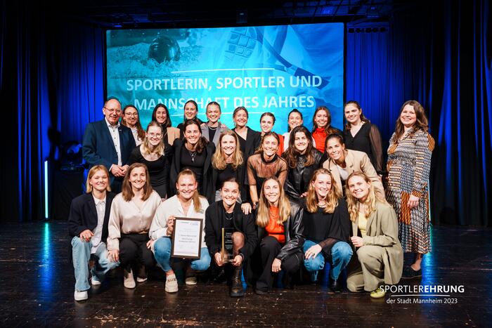 Oberbürgermeister Christian Specht mit der ersten Damenmannschaft des Mannheimer Hockeyclub 1907, der Mannschaft des Jahres 2023.